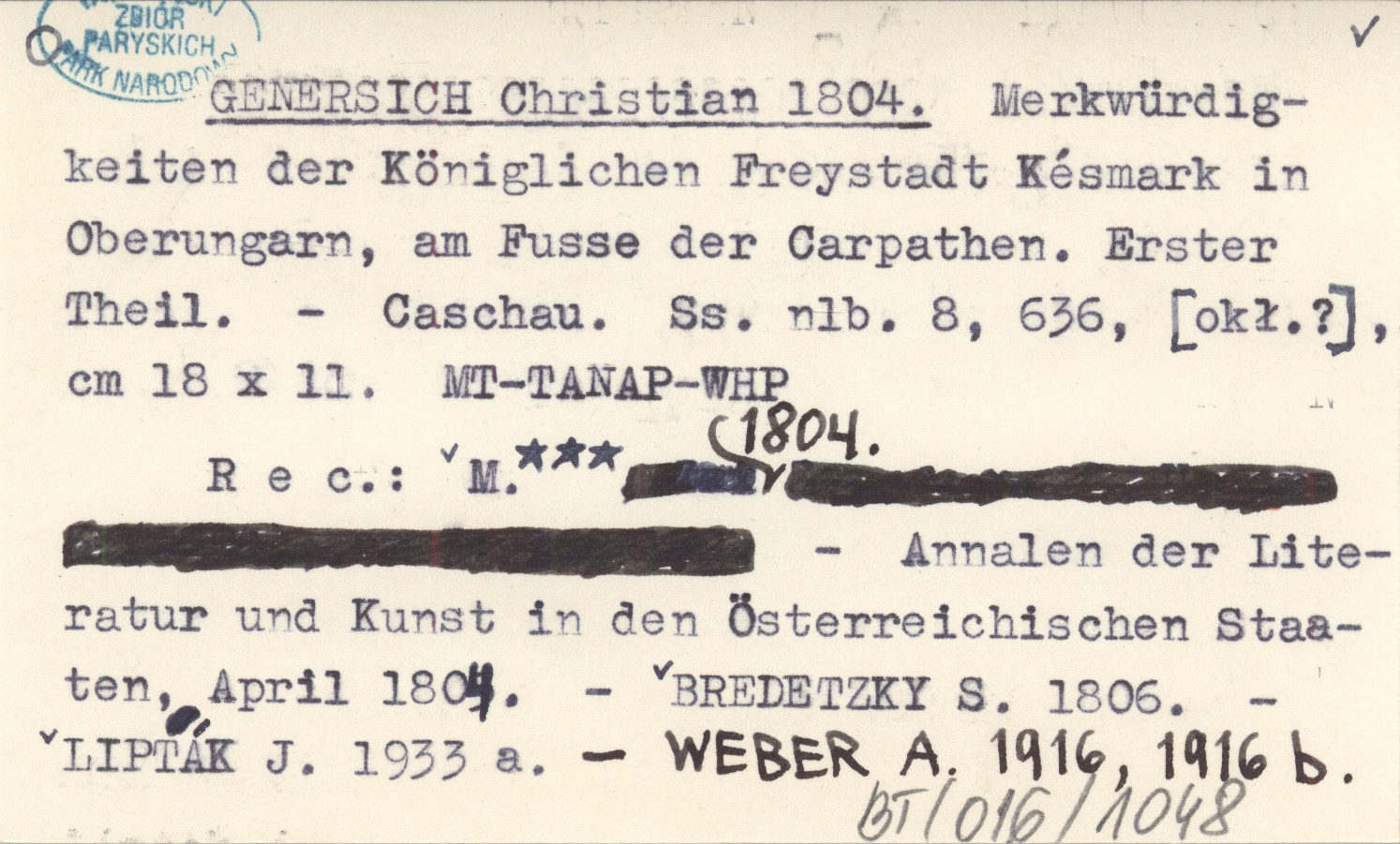 Caschau , [8], 636 s., [okł.?], 18x11 cm. REC: M. 1804 Annalen der Literatur und Kunst in den Österreichischen Staaten, April 1804 ; BREDETZKY S. 1806 ; LIPTÁK J. 1933 a ; WEBER A. 1916, 1916 b ;