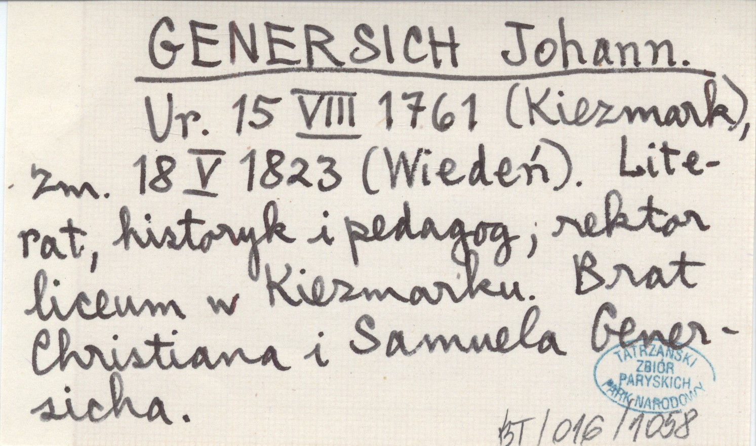 Ur. 15 VIII 1761 (Kiezmark), zm. 18 V 1823 (Wiedeń). Literat, historyk i pedagog, rektor liceum w Kiezmarku. Brat Christiana i Samuela Genersicha.