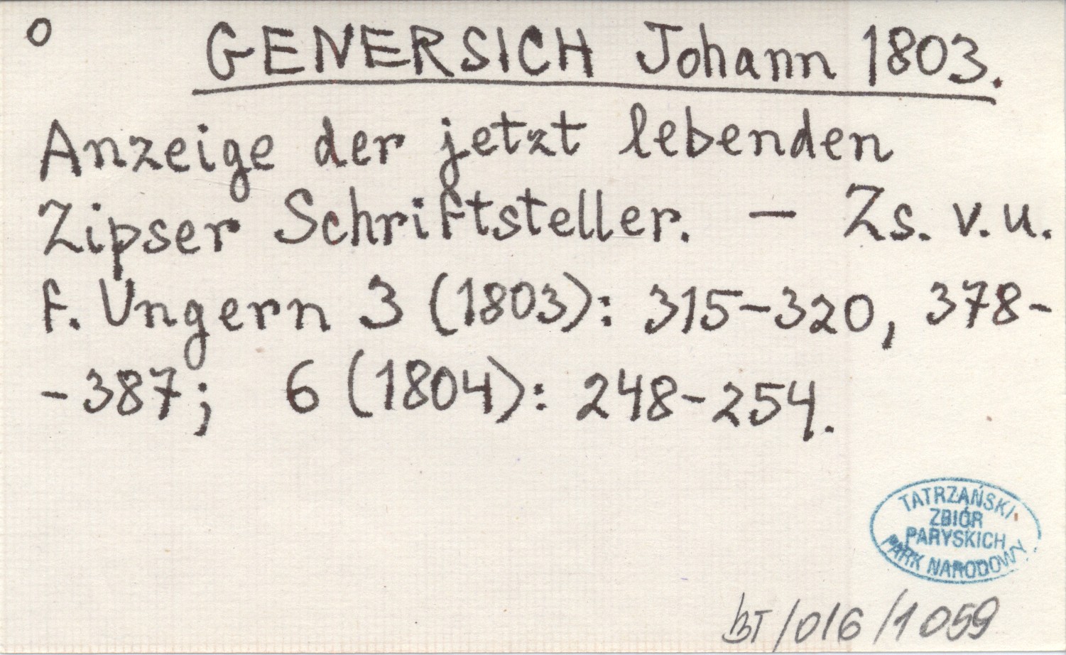 GENERSICH Johann 1803 Anzeige der jetzt lebenden Zipser Schriftsteller.