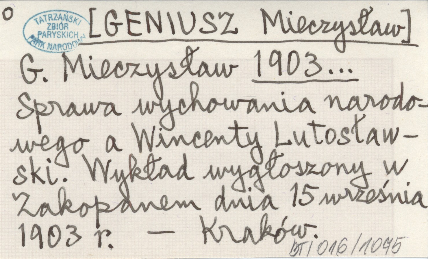G. Mieczysław [GENIUSZ Mieczysław] 1903... Sprawa wychowania narodowego a Wincenty Lutosławski. Wykład wygłoszony w Zakopanem dnia 15 września 1903 r.