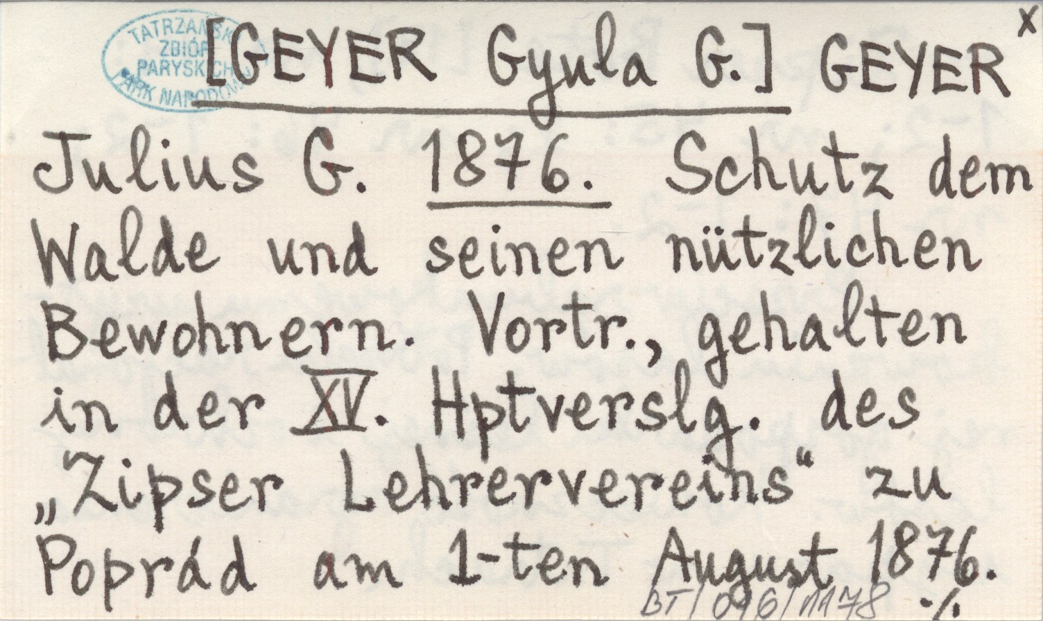 [GEYER Gyula G.] GEYER, Julius G. ; 1876 Schutz dem Walde und seinen nützlichen Bewohnern. Vortr., gehalten in der XV. Hptverslg. des "Zipser Lehrervereins" zu Poprád am 1-ten August 1876.