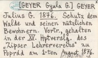[GEYER Gyula G.] GEYER, Julius G. ; 1876 Schutz dem Walde und seinen nützlichen Bewohnern. Vortr., gehalten in der XV. Hptverslg. des "Zipser Lehrervereins" zu Poprád am 1-ten August 1876.