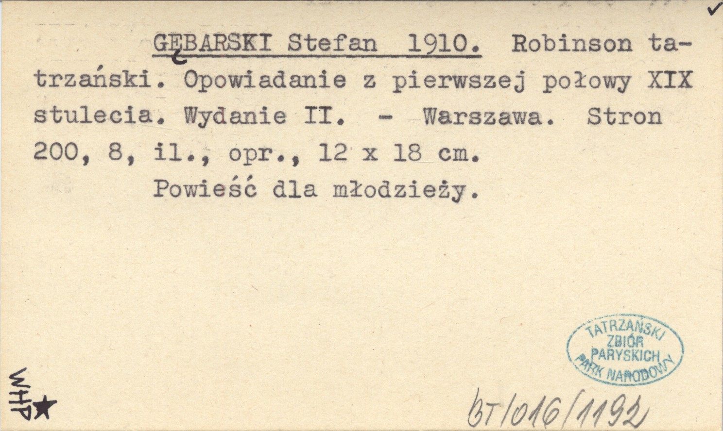 GĘBARSKI Stefan 1910 Robinson tatrzański. Opowiadanie z pierwszej połowy XIX stulecia.