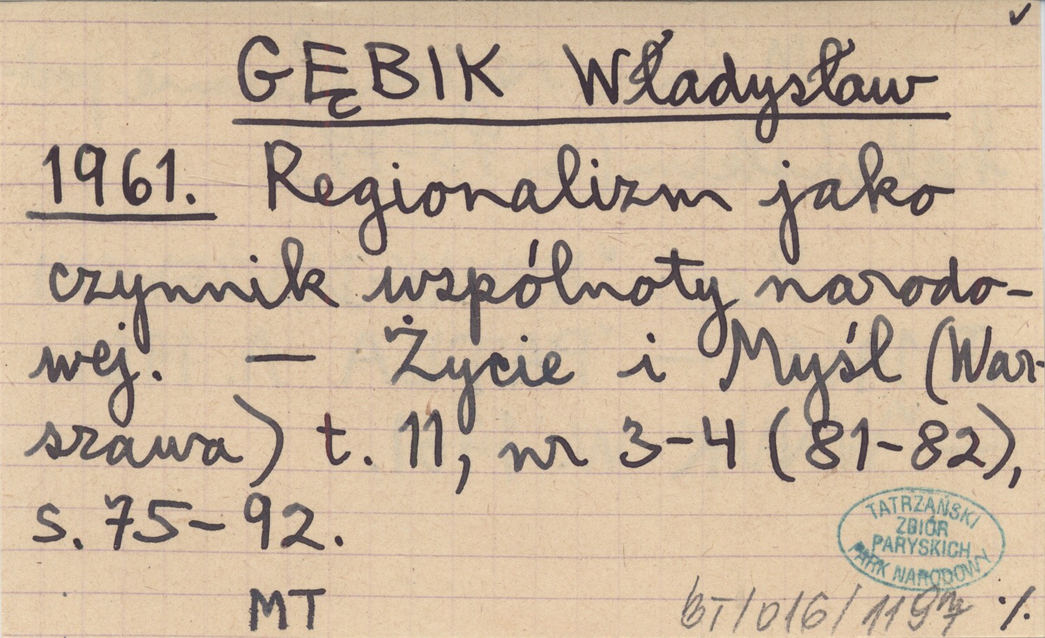 GĘBIK Władysław 1961 Regionalizm jako czynnik wspólnoty narodowej.