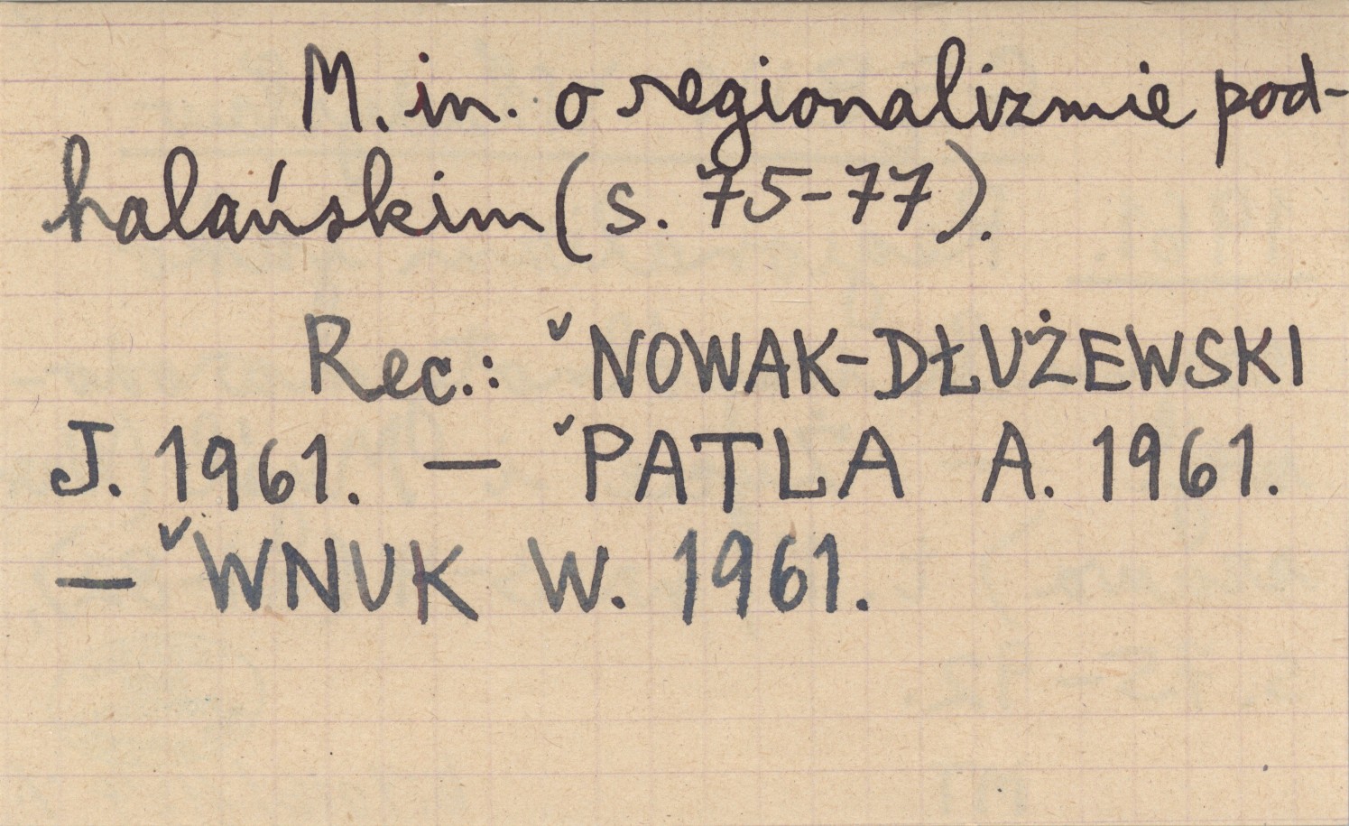 Życie i Myśl (Warszawa) , T. 11, nr 3-4 (81-82): 75-92. M.in. o regionalizmie podhalańskim (s. 75-77). REC: NOWAK-DŁUŻEWSKI J. 1961 ; PATLA A. 1961 ; WNUK W. 1961 ;