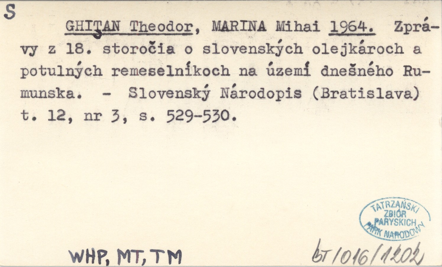 GHIŢAN Theodor MARINA, Mihai. ; 1964 Zprávy z 18. storočia o slovenských olejkároch a potulných remeselníkoch na území dneąného Rumunska.