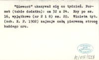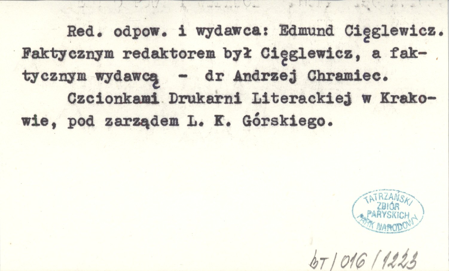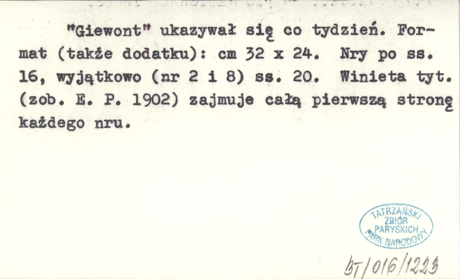 Andrzej Chramiec, Giewont (Zakopane) , Tygodnik zakopiański, poświęcony sprawom uzdrowiska i Tatr. Na okładkach nrów krócej: Tygodnik Zakopiański. Czasopismo to, finansowane przez dra Andrzeja Chramca, miało przeciwdziałać ukazującemu się równocześnie "Przeglądowi Zakopiańskiemu", nastawionemu krytycznie do działalności Chramca. "Giewont" ukazywał się co tydzień. Format (także dodatku): 32x24 cm. Nr po 16 s., wyjątkowo (nr 2 i 8) 20 s. Winieta tyt. (zob. E. P. 1902) zajmuje całą pierwszą stronę każdego nr. Wydano: 1902: Rok 1, nr 1 (2 VII, 16 s.), 2 (9 VII, 20 s.), 3 (16 VII, 16 s.), 4 (23 VII, 16 s.), dod. do nr 4 (bez daty, 1 s.), nr 5 (30 VII, 16 s.), 6 (6 VIII, 16 s.), 7 (13 VIII, 16 s.), 8 (20 VIII, 20 s.), 9 (3 IX, 16 s.). Razem 153 s., niektóre nr il. (nr 1-9). Red. odpow. i wydawca: Edmund Cięglewicz. Faktycznym redaktorem był Cięglewicz, a faktycznym wydawcą - dr Andrzej Chramiec. Czcionkami Drukarni Literackiej w Krakowie, pod zarządem L. K. Górskiego. Autorzy: Asta (krypt., nie dotyczy ani Tatr, ani Podtatrza), Tadeusz Bednarski (przedruk?), Ludomir Benedyktowicz, Edmund Bieder (nie dotyczy), Antoni Brykczyński (przedruk), Andrzej Chramiec, Leon Chwistek, Edmund Cięglewicz, Jan Czubek (jako tłum.?), Walerian Dzieślewski (przedruk), E. P. (krypt., tylko winieta tyt.), Walery Eljasz-Radzikowski, Karol Englisch, Walenty Gadowski, Heinrich Heine (nie dotyczy), Horacy (nie dotyczy), K. Z. (krypt.), Kazimierz Kaszelewski, Klon (krypt., nie dotyczy), Stanisław Roman Lewandowski, Tadeusz Łopuszański, Franciszek Henryk Nowicki, Lucjan Rydel (nie dotyczy), Stephan (przedruk), Maria Strzelecka, Bronisław Tabor, Kazimierz Tetmajer (przedruk), Włodzimierz Tetmajer, Tlemon (krypt., nie dotyczy), Arystoteles Valaoritis (nie dotyczy), Marian Wawrzeniecki (streszcz. pracy drukowanej gdzie indziej) oraz anonimowi.