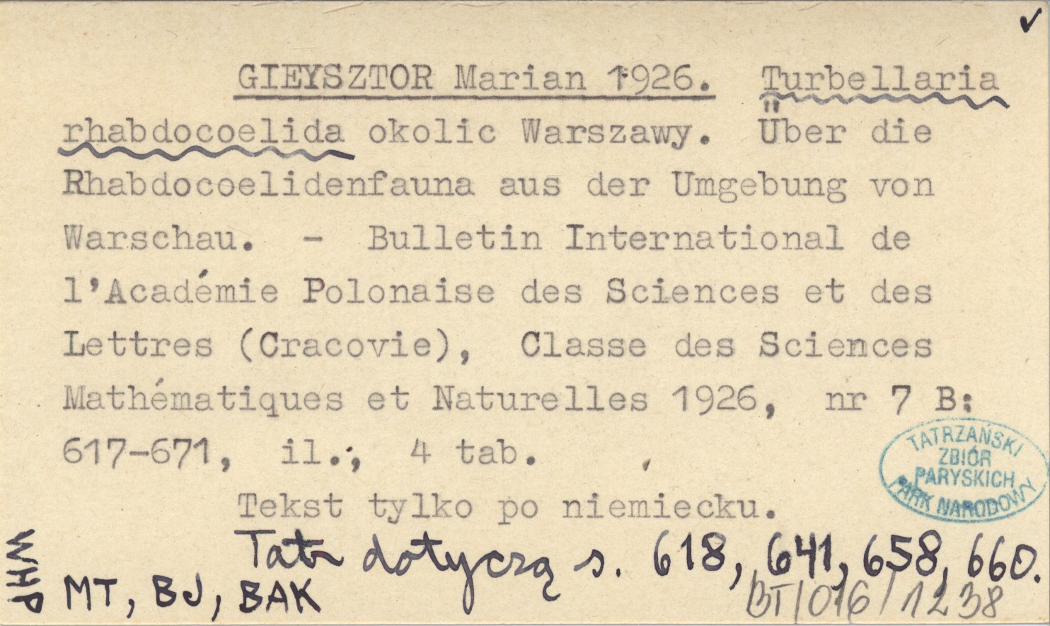GIEYSZTOR Marian 1926 Turbellaria rhabdocoelida okolic Warszawy. Űber die Rhabdocoelidenfauna aus der Umgebung von Warschau.