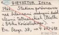 GIEYSZTOR Irena 1966 Studium porównawcze nad bilansami wodnymi dwóch zlewni tatrzańskich (Białki i Potoku Kościeliskiego).