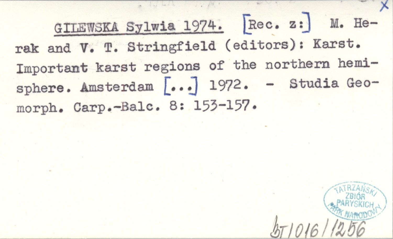 GILEWSKA Sylwia 1974 M. Herak and V. T. Stringfield (editors): Karst. Important karst regions of the northern hemisphere. Amsterdam [...] 1972.