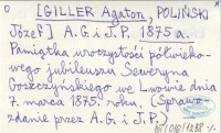 A. G. [GILLER Agaton] POLIŃSKI, Józef. ; 1875 a Pamiątka uroczystości półwiekowego jubileuszu Seweryna Goszczyńskiego we Lwowie dnia 7. marca 1875. roku. (Sprawozdanie przez A. G. i J. P.).