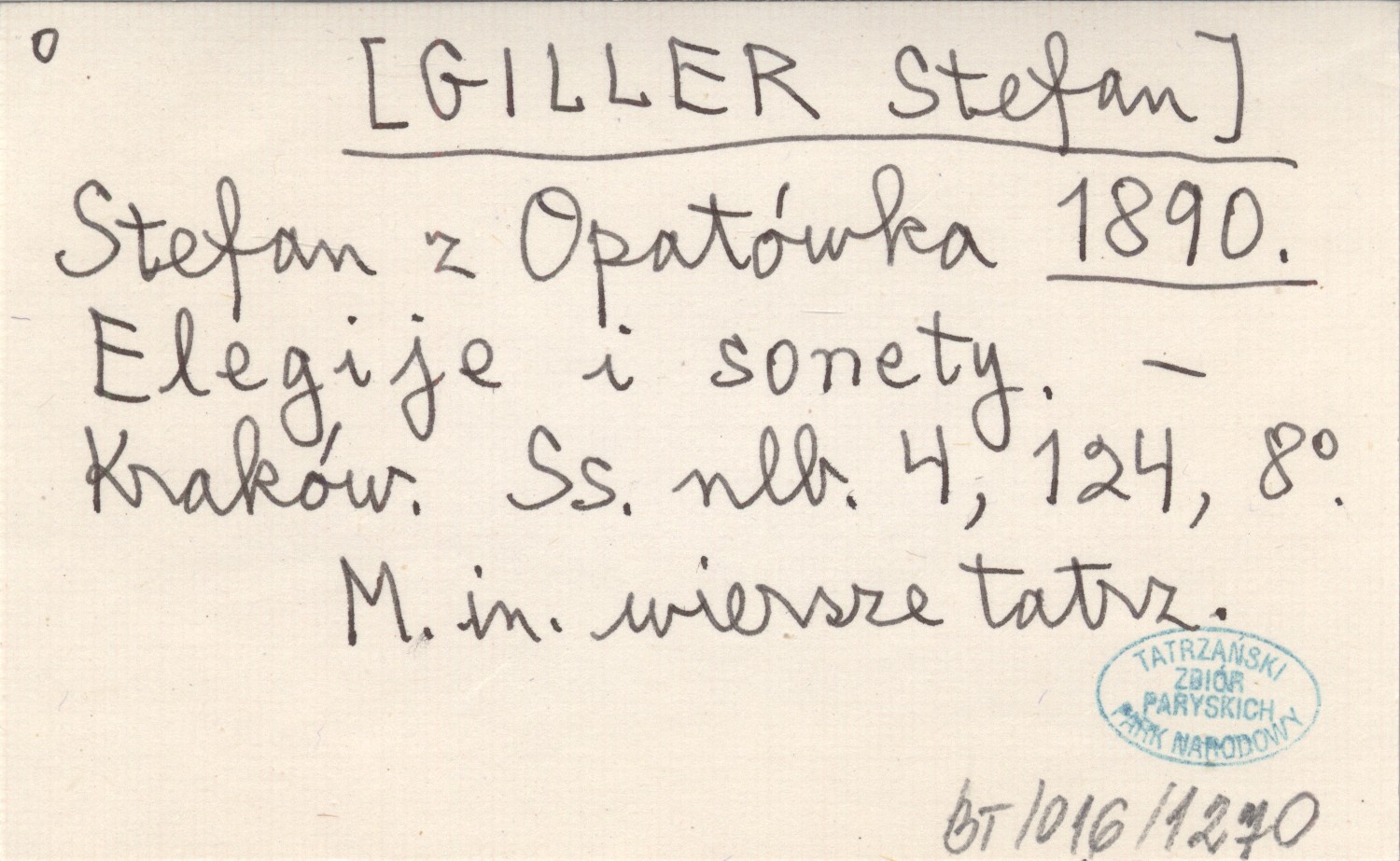 Stefan z Opatówka [GILLER Stefan] 1890 Elegije i sonety.