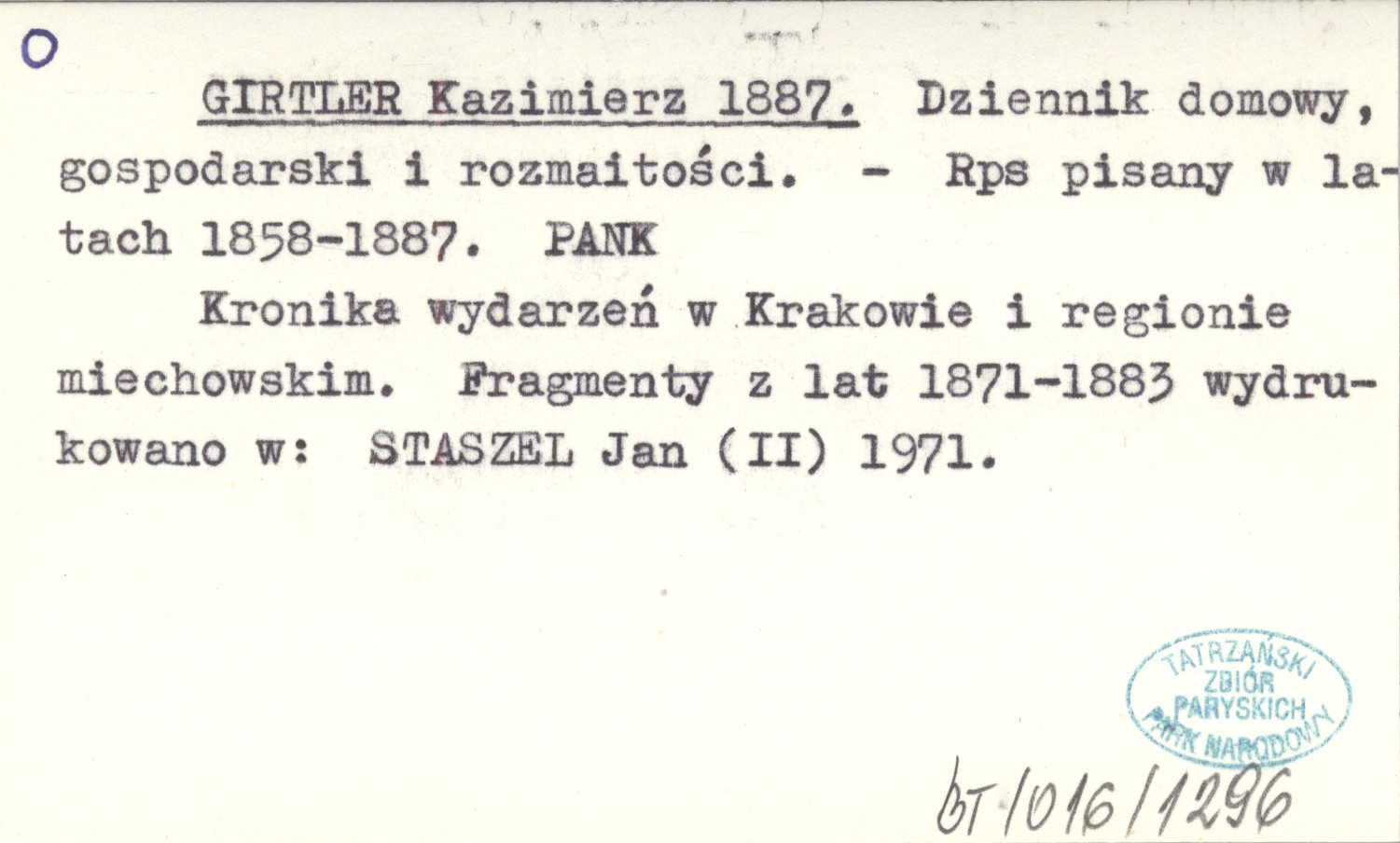 , Kronika wydarzeń w Krakowie i regionie miechowskim. Rękopis pisany w latach 1858-1887. Fragmenty z lat 1871-1883 wydrukowano w: STASZEL Jan (II) 1971.