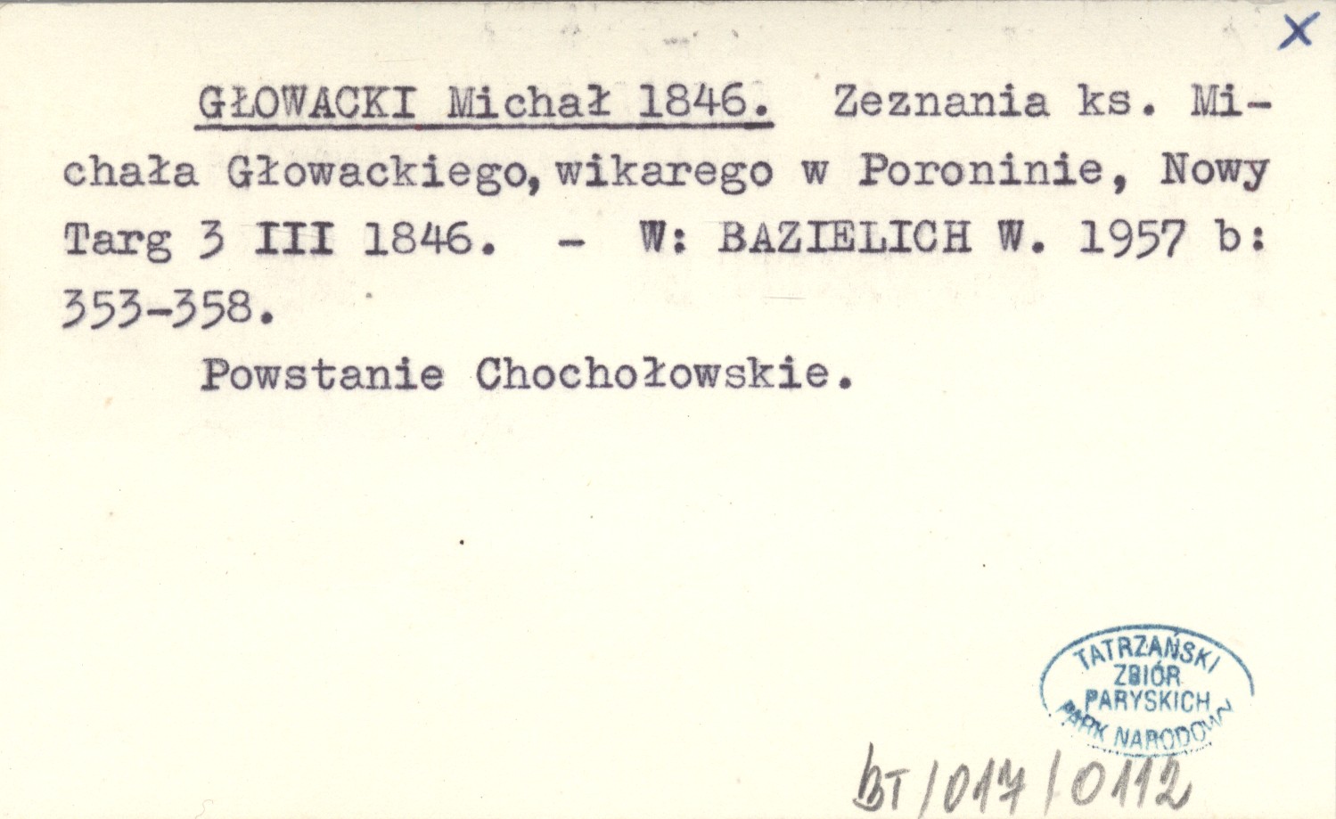GŁOWACKI Michał 1846 Zeznania ks. Michała Głowackiego, wikarego w Poroninie, Nowy Targ 3 III 1846.