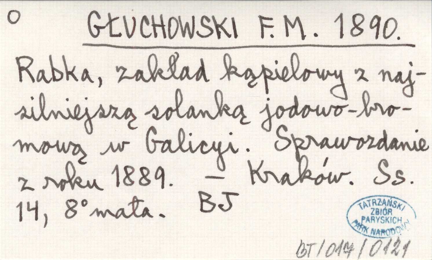 GŁUCHOWSKI F. M. 1890 Rabka, zakład kąpielowy z najsilniejszą solanką jodowo-bromową w Galicyi. Sprawozdanie z roku 1889.
