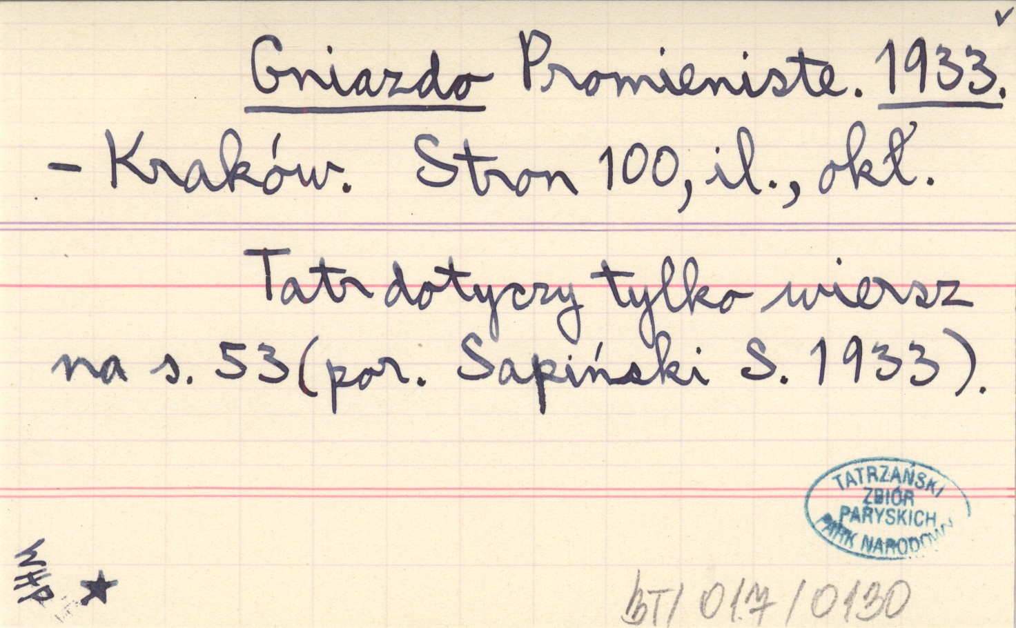 Kraków , 100 s., il., okł. Tatr dotyczy tylko wiersz na s. 53 (por. Sapiński S. 1933).