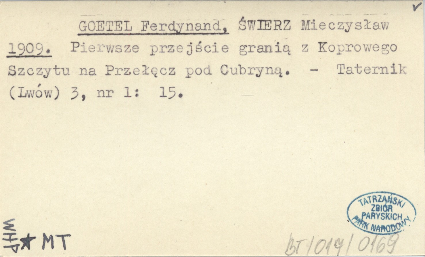 GOETEL Ferdynand ŚWIERZ, Mieczysław. ; 1909 Pierwsze przejście granią z Koprowego Szczytu na Przełęcz pod Cubryną.