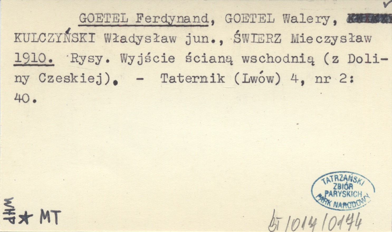 GOETEL Ferdynand GOETEL, Walery. ; KULCZYŃSKI, Władysław jun. ; ŚWIERZ, Mieczysław. ; 1910 Rysy. Wyjście ścianą wschodnią (z Doliny Czeskiej).