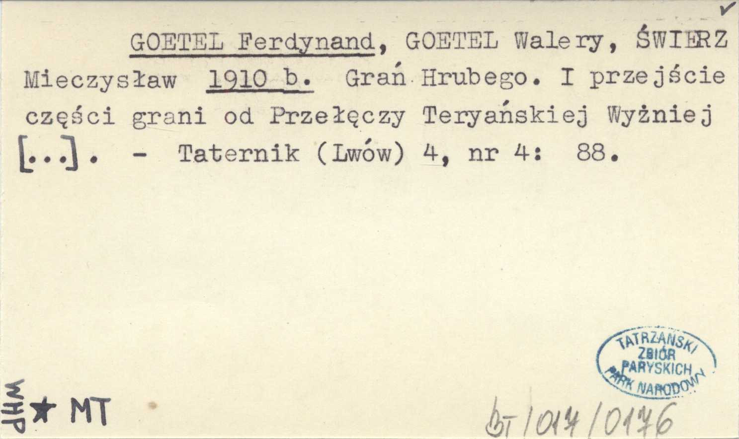 GOETEL Ferdynand GOETEL, Walery. ; ŚWIERZ, Mieczysław. ; 1910 b Grań Hrubego. I przejście części grani od Przełęczy Teryańskiej Wyżniej [...].