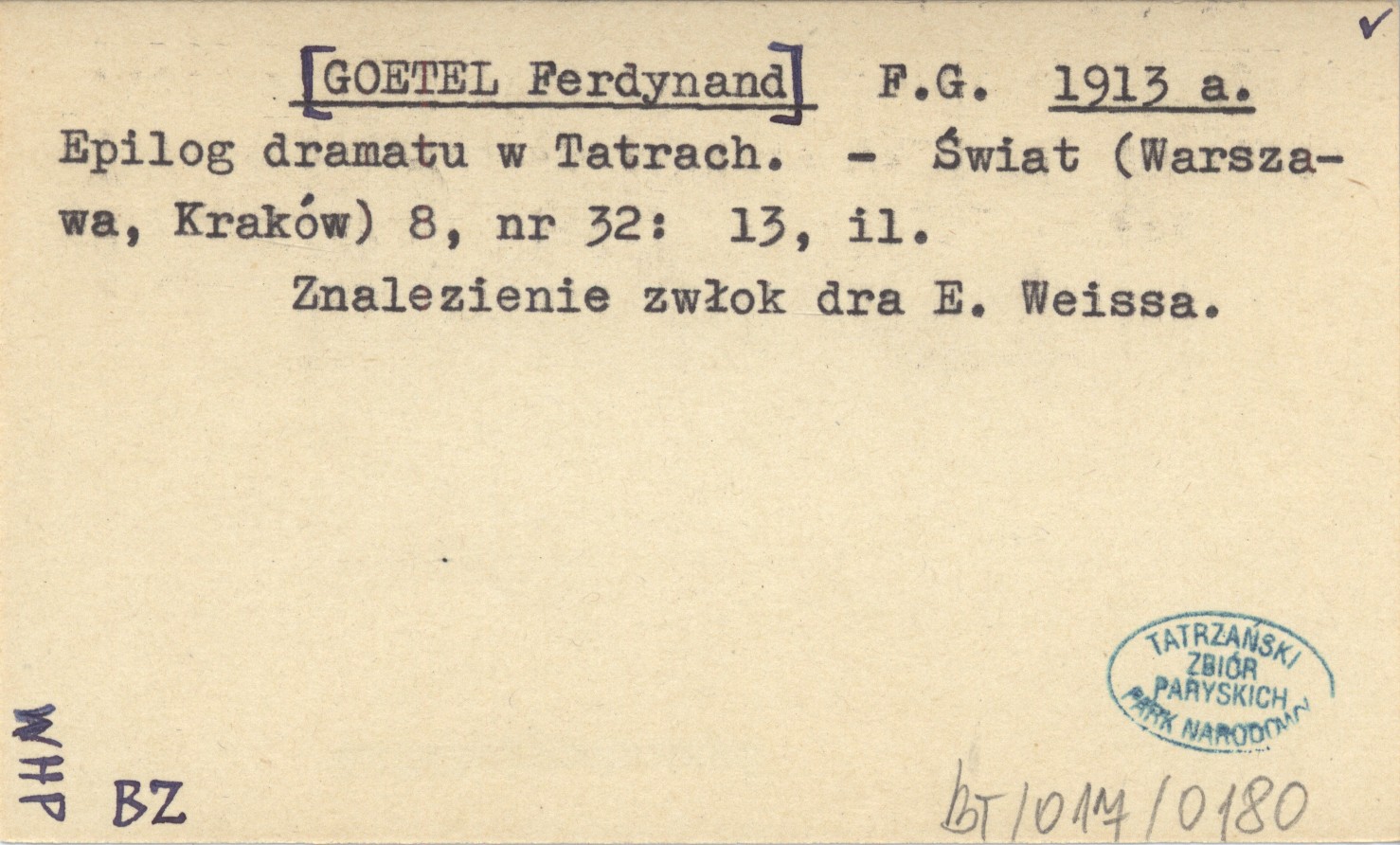 F.G. [GOETEL Ferdynand] 1913 a Epilog dramatu w Tatrach.