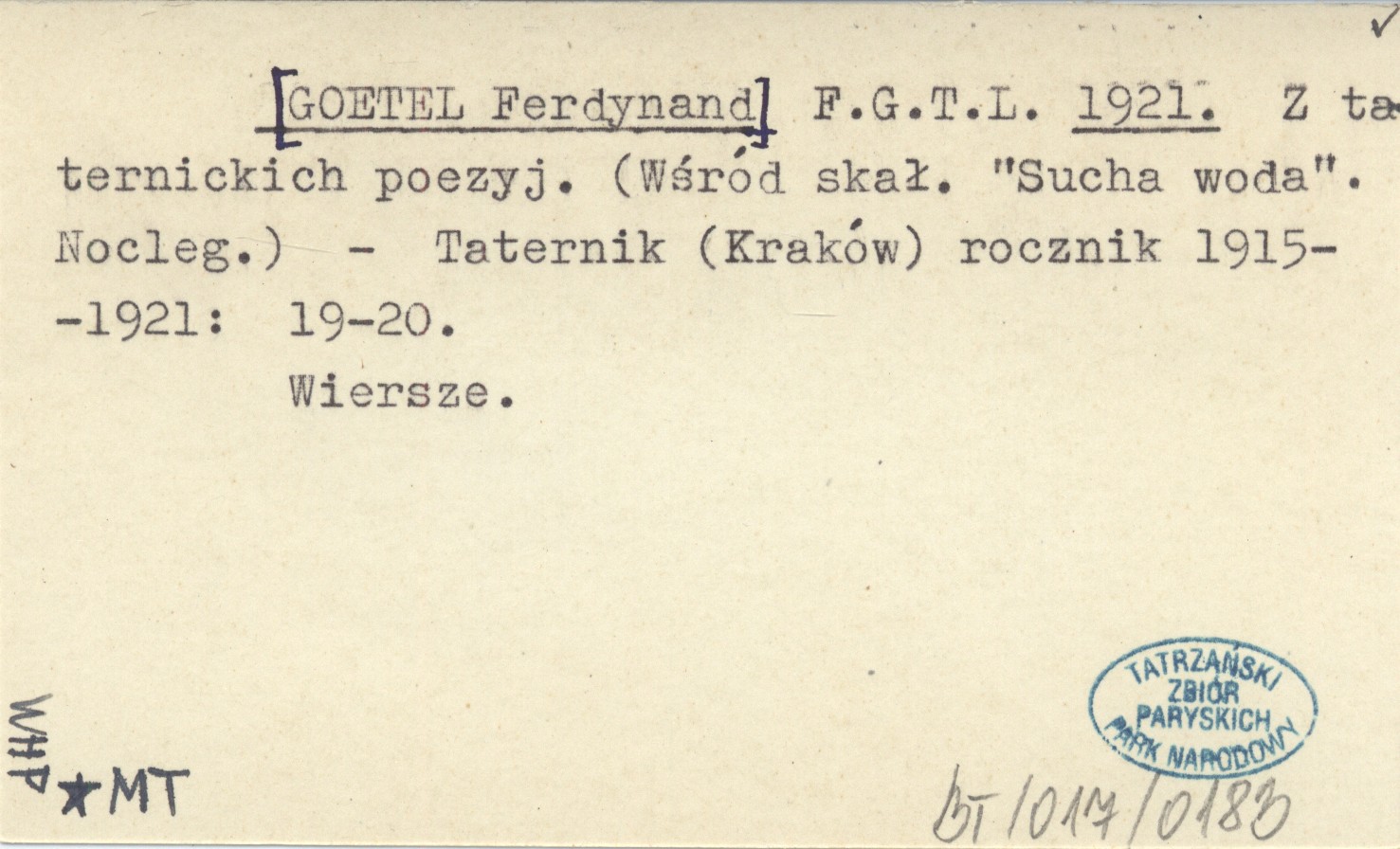 F. G. T. L. [GOETEL Ferdynand] 1921 Z taternickich poezyj. (Wśród skał. "Sucha woda". Nocleg.).
