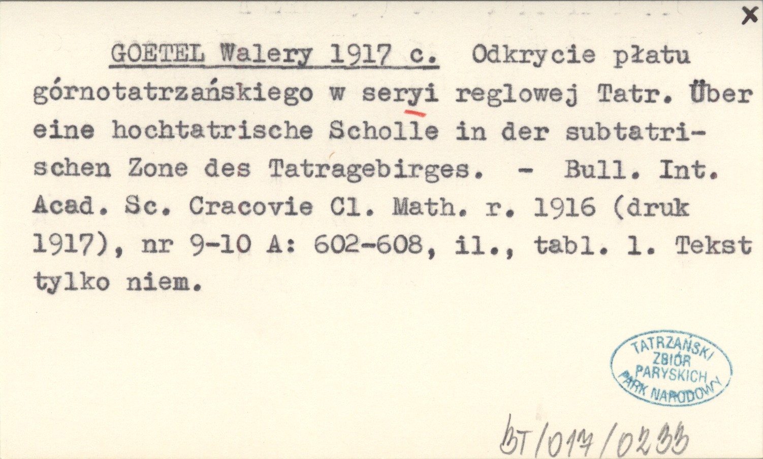 GOETEL Walery 1917 c Odkrycie płatu górnotatrzańskiego w seryi reglowej Tatr. Über eine hochtatrische Scholle in der subtatrischen Zone des Tatragebirges.