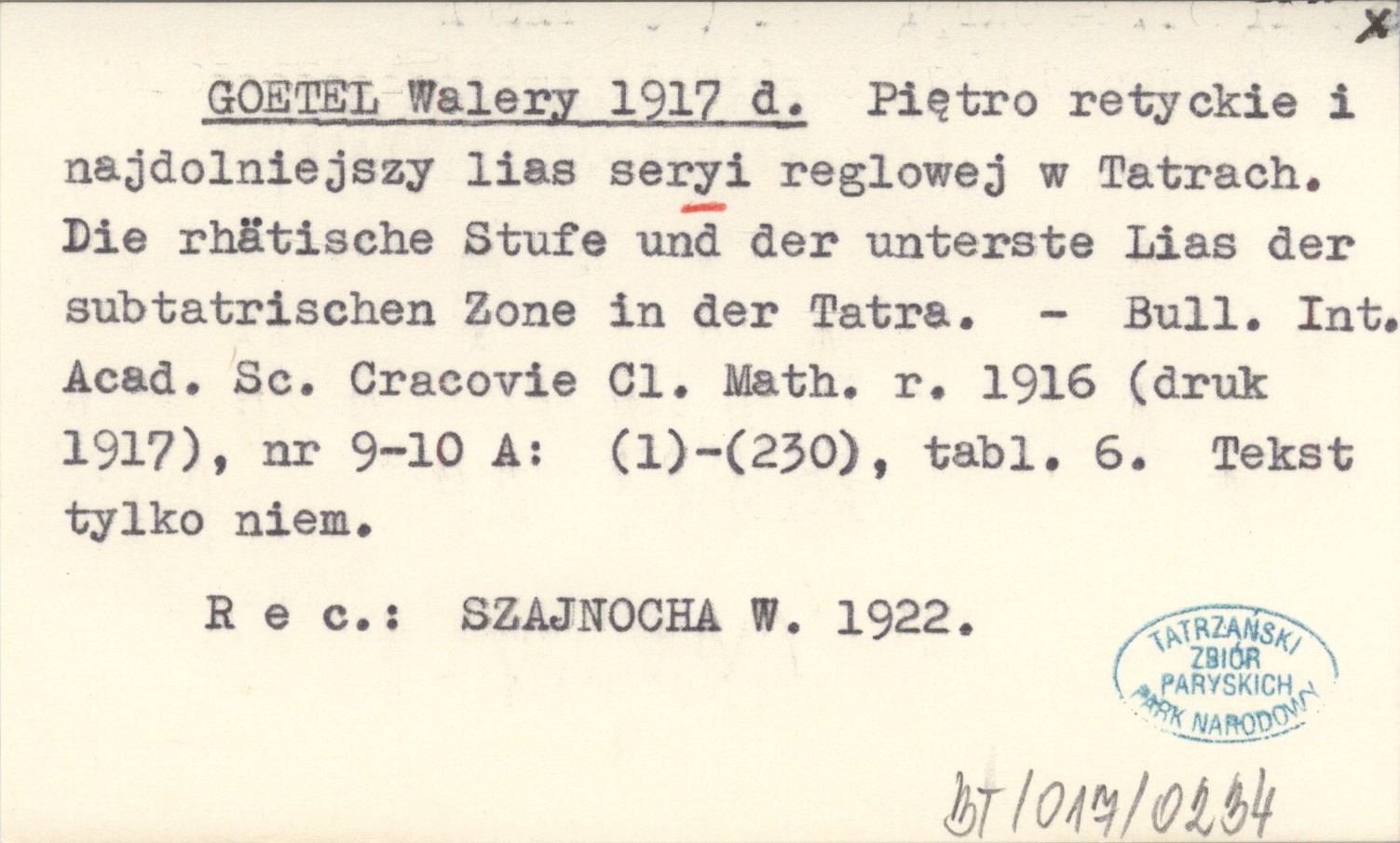 GOETEL Walery 1917 d Piętro retyckie i najdolniejszy lias seryi reglowej w Tatrach. Die rhätische Stufe und der unterste Lias der subtatrischen Zone in der Tatra.
