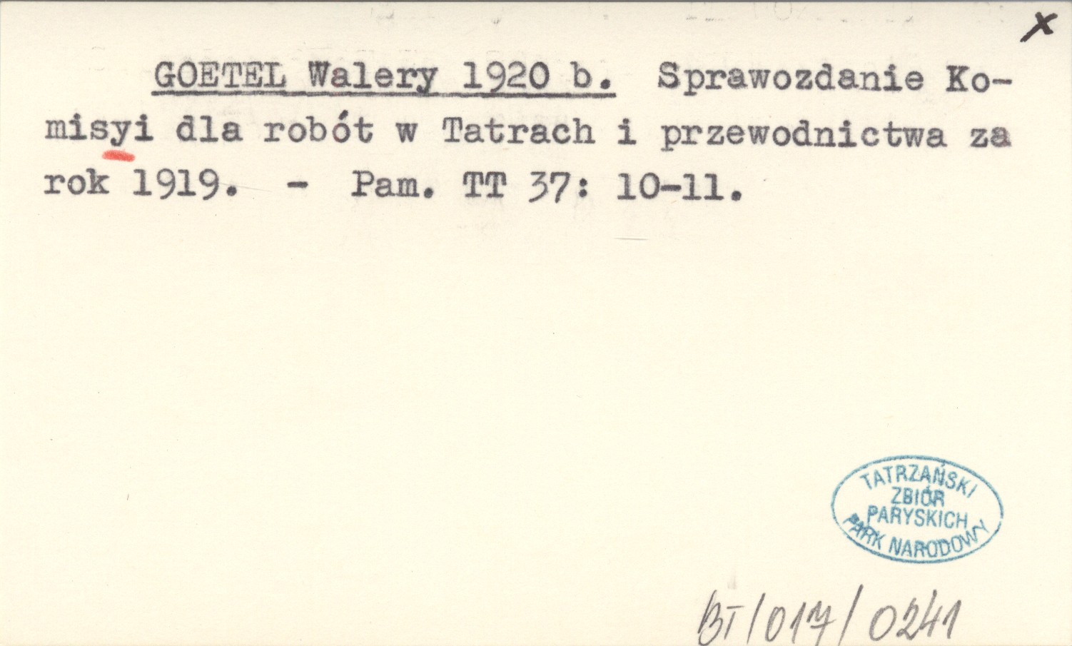 GOETEL Walery 1920 b Sprawozdanie Komisyi dla robót w Tatrach i przewodnictwa za rok 1919.