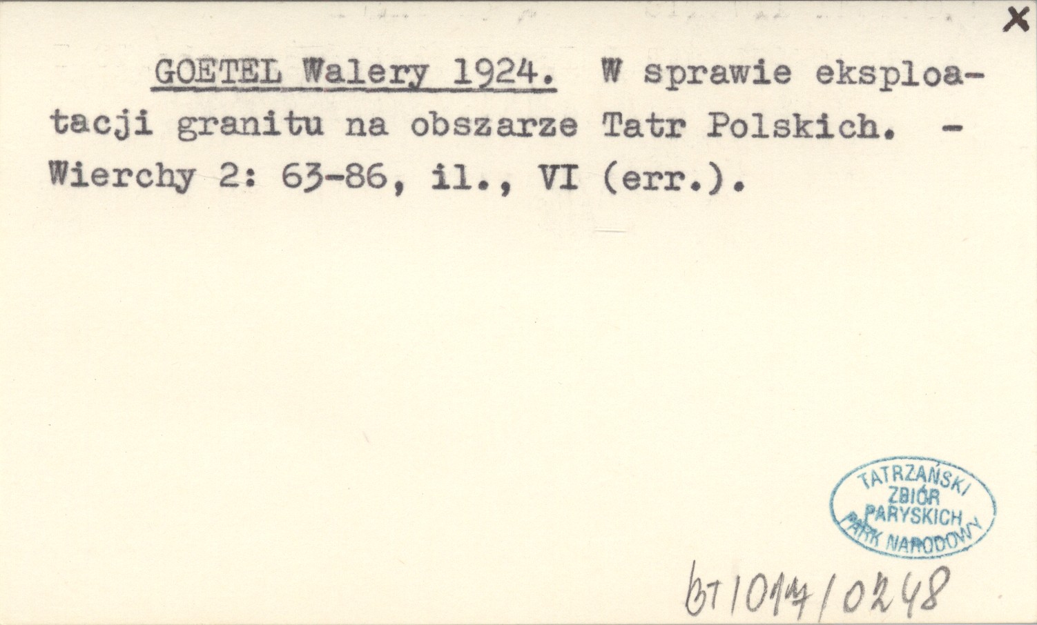 GOETEL Walery 1924 W sprawie eksploatacji granitu na obszarze Tatr Polskich.