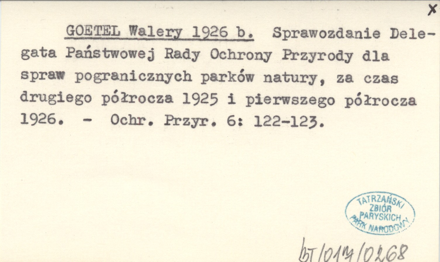 GOETEL Walery 1926 b Sprawozdanie Delegata Państwowej Rady Ochrony Przyrody dla spraw pogranicznych parków natury, za czas drugiego półrocza 1925 i pierwszego półrocza 1926.
