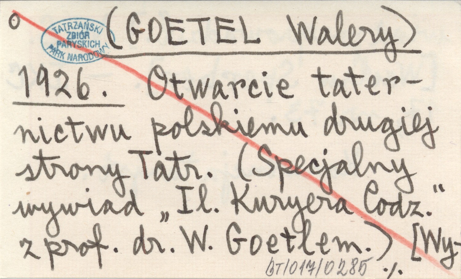 (GOETEL Walery) 1926 Otwarcie taternictwu polskiemu drugiej strony Tatr. (Specjalny wywiad "Il. Kuryera Codz." z prof. dr. W. Goetlem.) [Wywiad przeprowadził:] W. S. [Wacław Sperber].