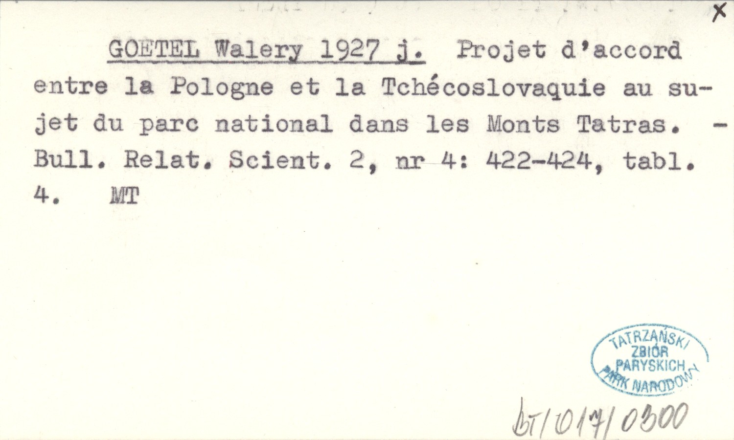 GOETEL Walery 1927 j Projet d'accord entre la Pologne et la Tchécoslovaquie au sujet du parc national dans les Monts Tatras.