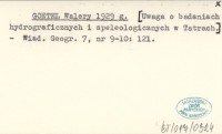 GOETEL Walery 1929 g [Uwaga o badaniach hydrograficznych i speleologicznych w Tatrach.].