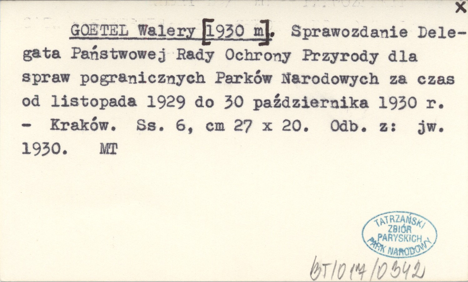 GOETEL Walery [1930 m] Sprawozdanie Delegata Państwowej Rady Ochrony Przyrody dla spraw pogranicznych Parków Narodowych za czas od listopada 1929 do 30 października 1930 r.