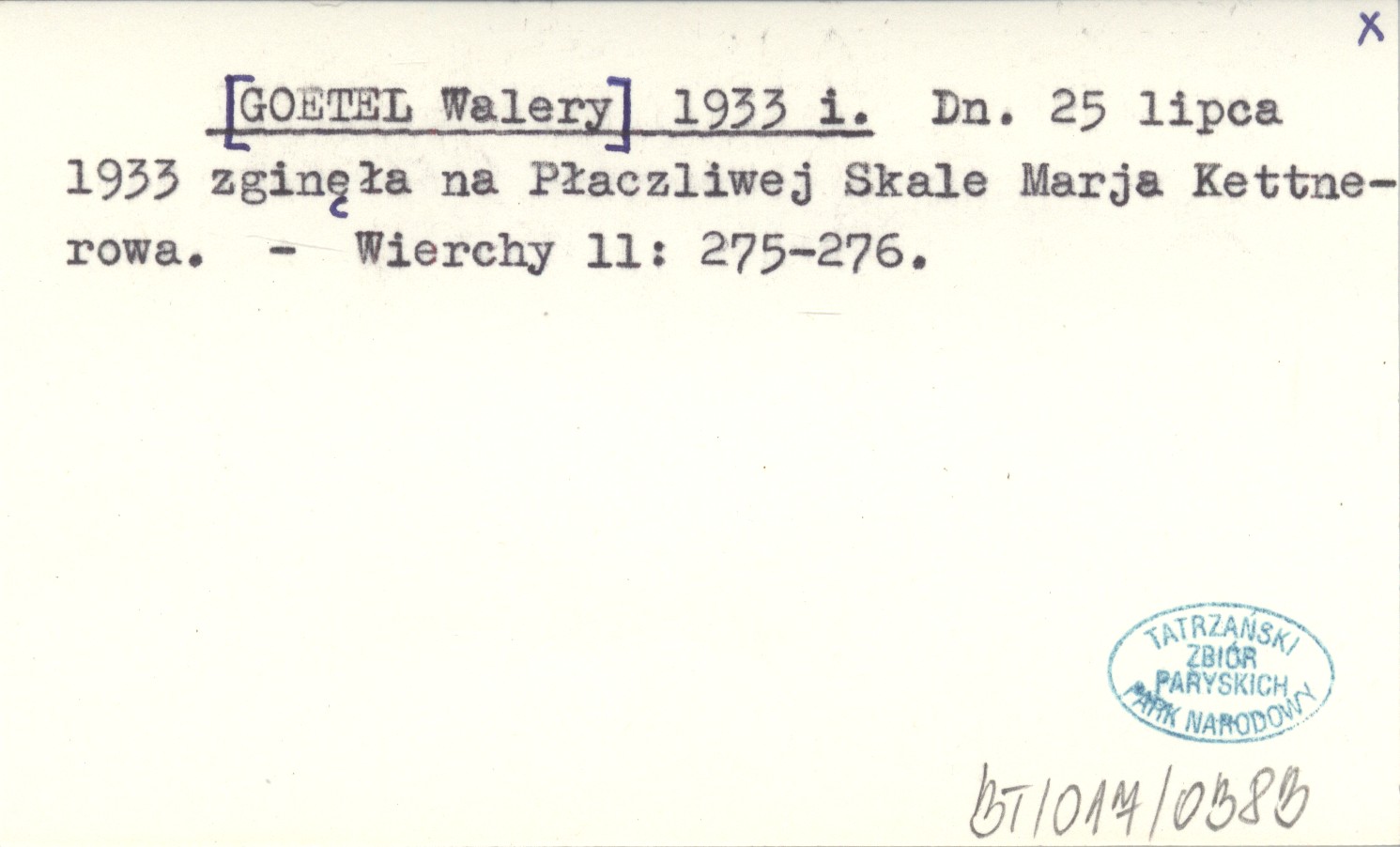 [GOETEL Walery] 1933 i Dn. 25 lipca 1933 zginęła na Płaczliwej Skale Marja Kettnerowa.