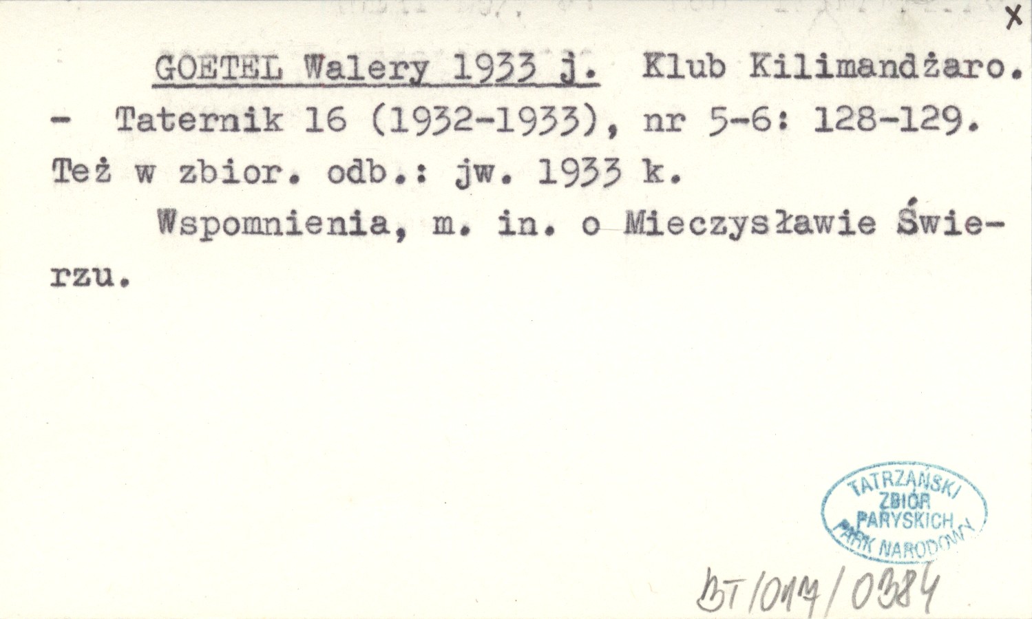 Taternik, 16 (1932-1933), nr 5-6: 128-129. Wspomnienia, m.in. o Mieczysławie Świerzu. Też w zbior. odb.: jw. 1933 k