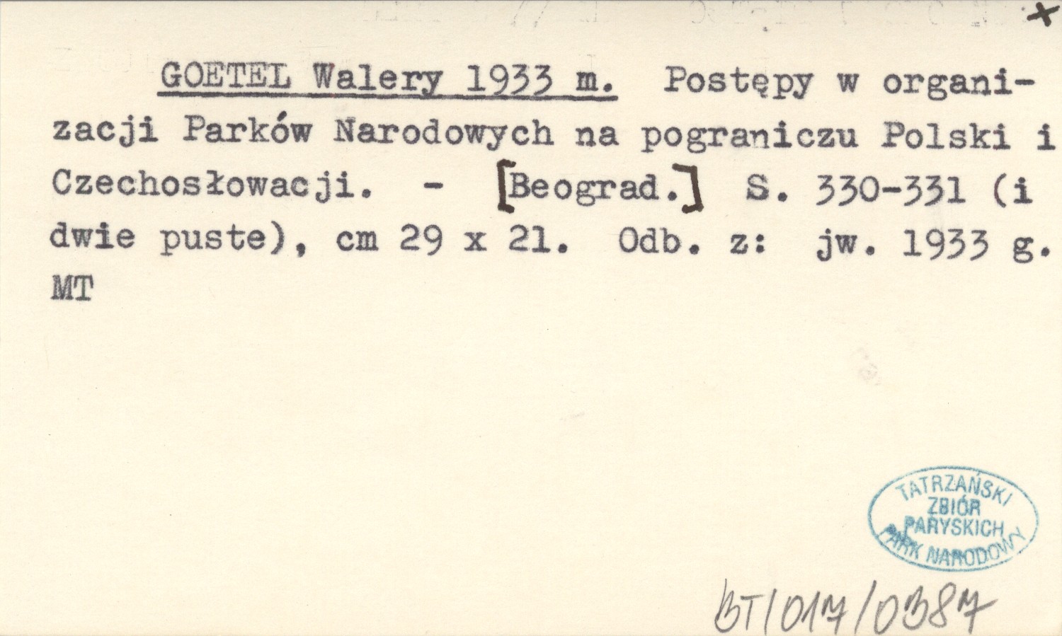 GOETEL Walery 1933 m Postępy w organizacji Parków Narodowych na pograniczu Polski i Czechosłowacji.