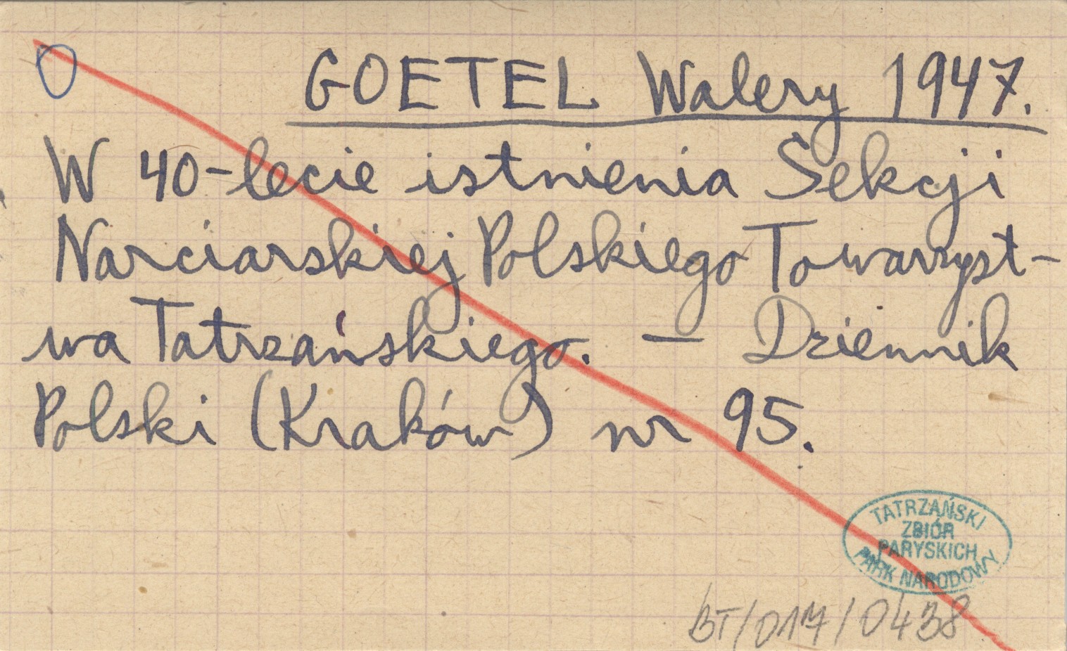 GOETEL Walery 1947 W 40-lecie istnienia Sekcji Narciarskiej Polskiego Towarzystwa Tatrzańskiego.