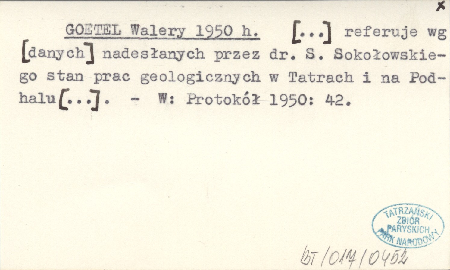 GOETEL Walery 1950 h [...] referuje wg [danych] nadesłanych przez dr. S. Sokołowskiego stan prac geologicznych w Tatrach i na Podhalu [...].