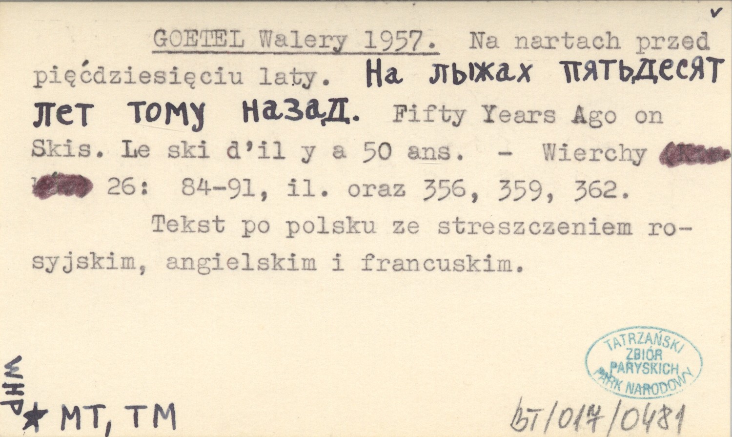 GOETEL Walery 1957 Na nartach przed pięćdziesięciu laty. Na lyžach pjat'desjat let tomu nazad. Fifty Years Ago on Skis. Le ski d'il y a 50 ans.