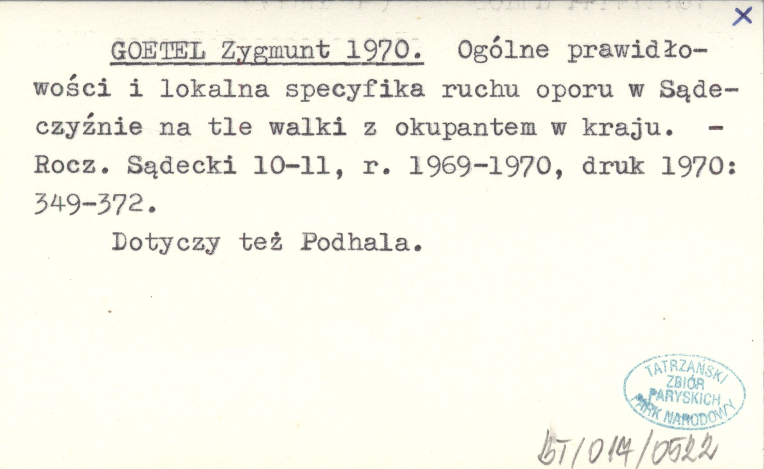 GOETEL Zygmunt 1970 Ogólne prawidłowości i lokalna specyfika ruchu oporu w Sądeczyźnie na tle walki z okupantem w kraju.