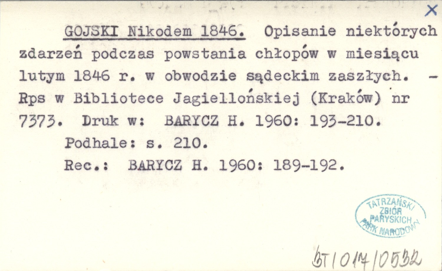 GOJSKI Nikodem 1846 Opisanie niektórych zdarzeń podczas powstania chłopów w miesiącu lutym 1846 r. w obwodzie sądeckim zaszłych.