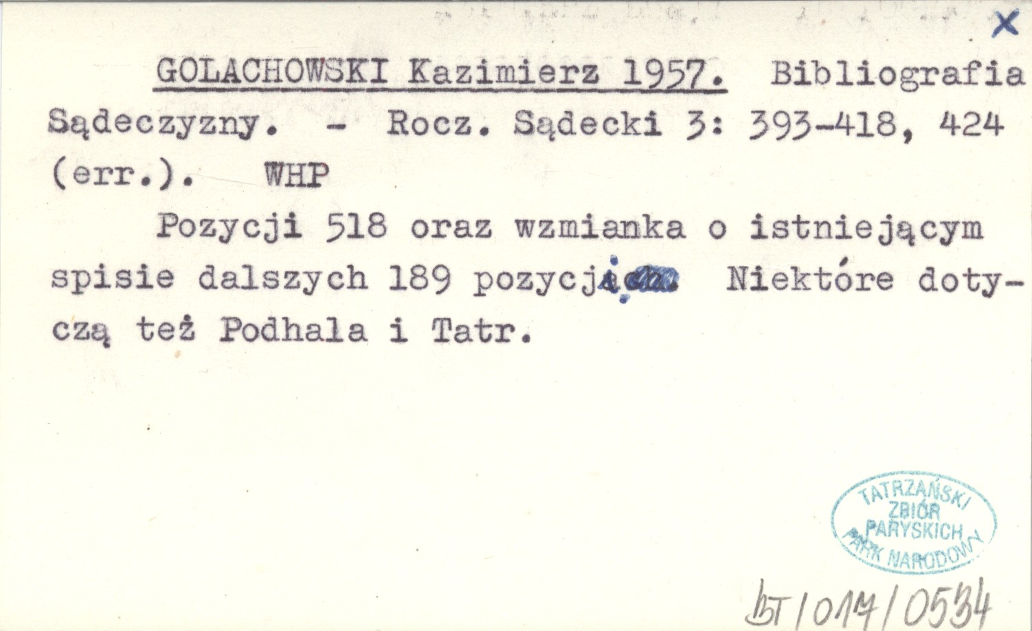 Rocznik Sądecki, 3: 393-418, 424 (err.). Pozycji 518 oraz wzmianka o istniejącym spisie dalszych 189 pozycji. Niektóre dotyczą też Podhala i Tatr.
