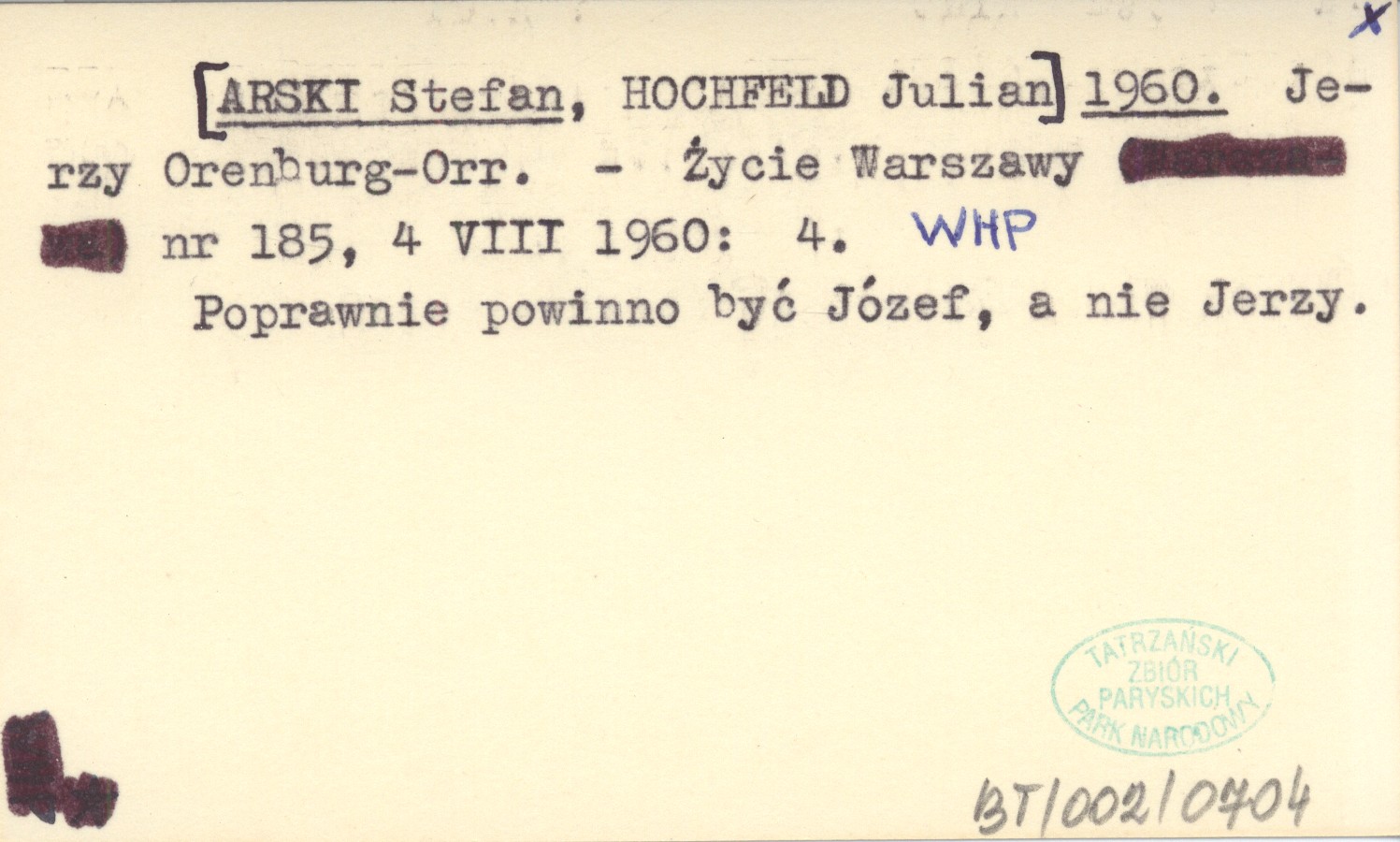 [ARSKI Stefan] HOCHFELD, Julian. ; 1960 Jerzy Orenburg-Orr.