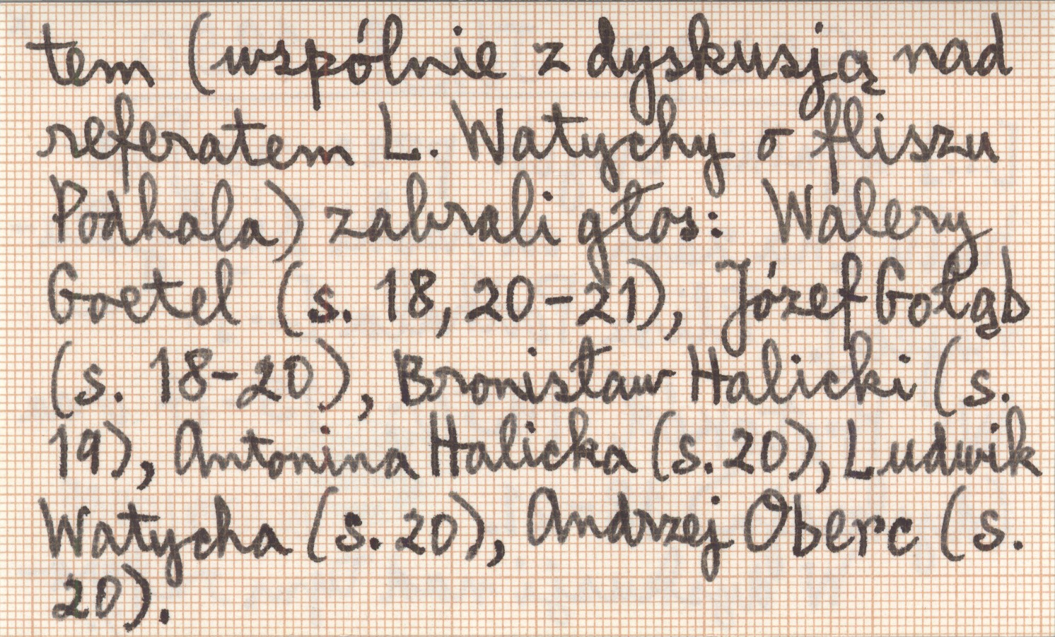 Protokół 1950. , S. 15-17, 18-21 (dyskusja). W dyskusji nad tym referatem (wspólnie z dyskusją nad referatem L. Watychy o fliszu Podhala) zabrali głos: Walery Goetel (s. 18, 20-21), Józef Gołąb (s. 18-20), Bronisław Halicki (s. 19), Antonina Halicka (s. 20), Ludwik Watycha (s. 20), Andrzej Oberc (s. 20).