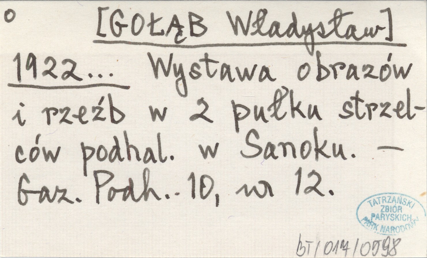 [GOŁĄB Władysław] 1922... Wystawa obrazów i rzeźb w 2 pułku strzelców podhal. w Sanoku.