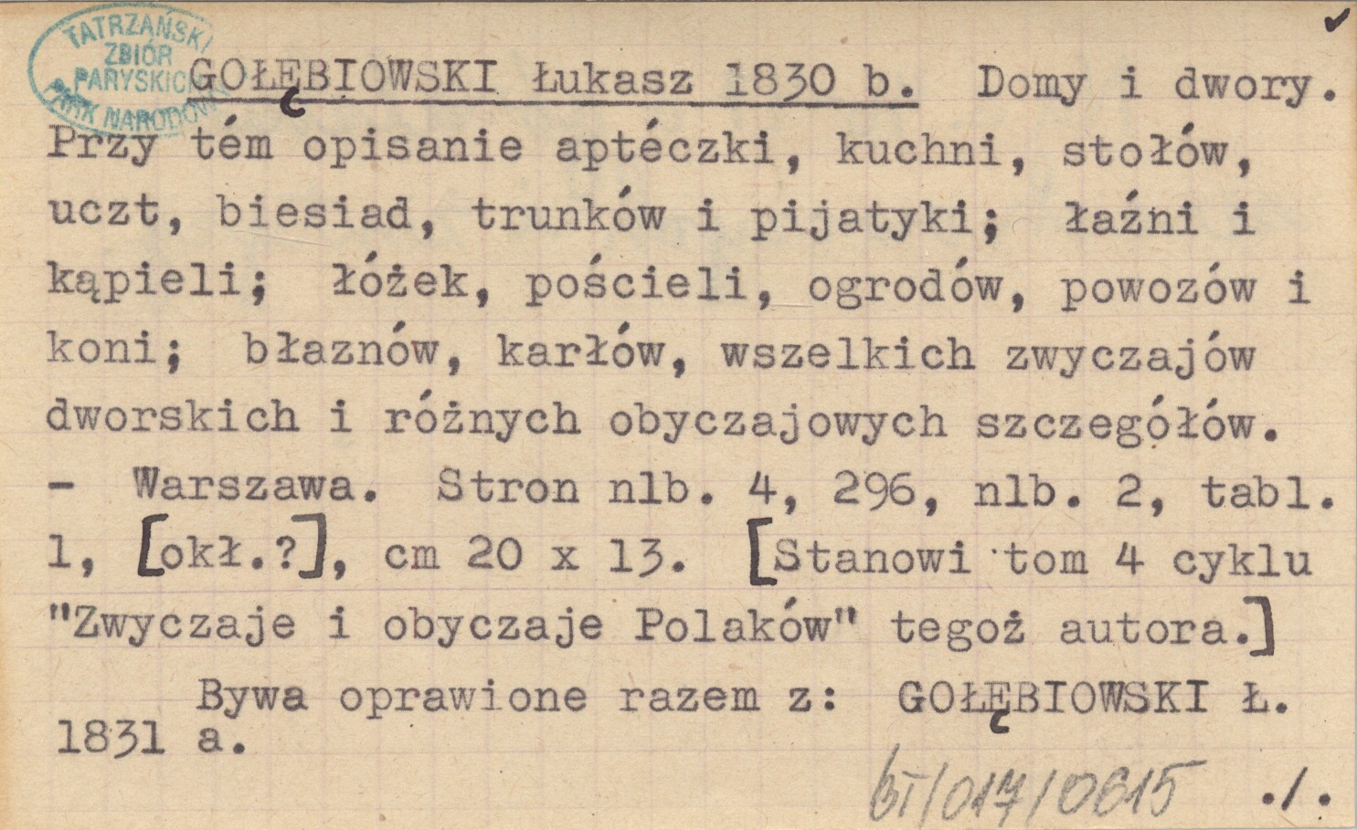 GOŁĘBIOWSKI Łukasz 1830 b Domy i dwory. Przy tém opisanie aptéczki, kuchni, stołów, uczt, biesiad, trunków i pijatyki; łaźni i kąpieli; łóżek, pościeli, ogrodów, powozów i koni; błaznów, karłów, wszelkich zwyczajów dworskich i różnych obyczajowych szczegółów.