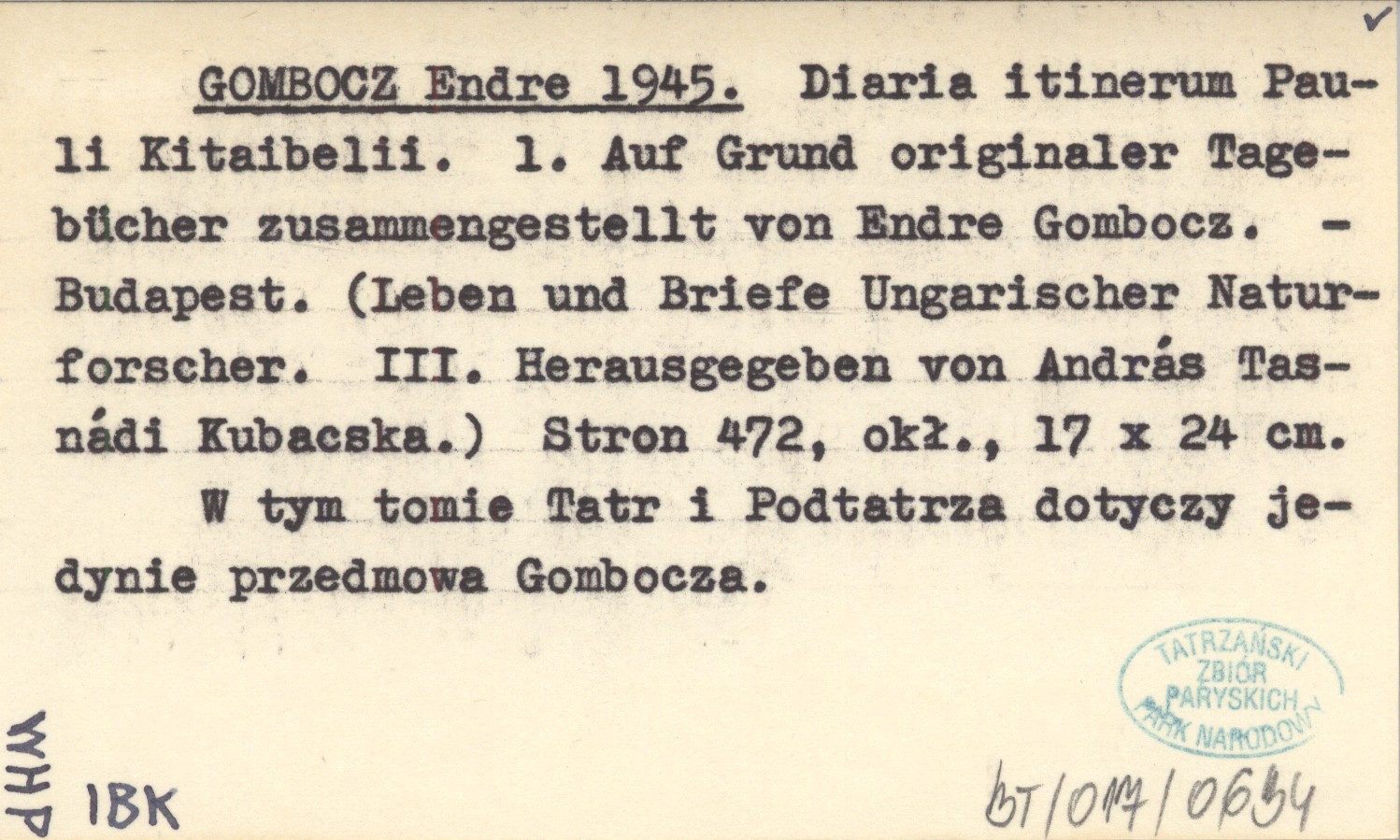 Leben und Briefe Ungarischer Naturforscher. III. Herausgegeben von András Tasnádi Kubacska. (Budapest) , 472 s., okł., 17x24 cm. W tym tomie Tatr i Podtatrza dotyczy jedynie przedmowa Gombocza.