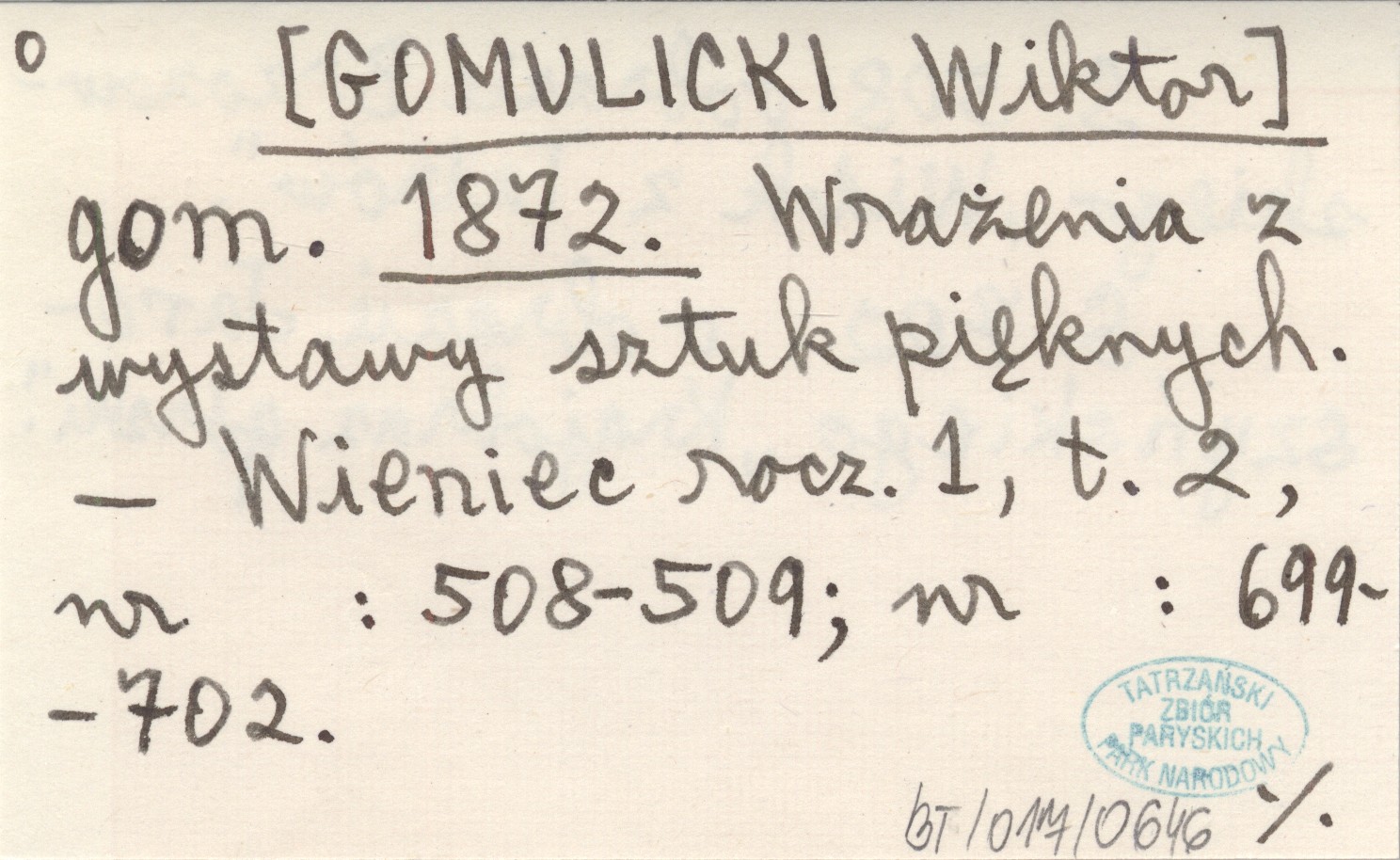 gom. [GOMULICKI Wiktor] 1872 Wrażenia z wystawy sztuk pięknych.