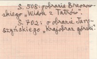 Wieniec, R. 1, t. 2, s. 508-509, 699-702. S. 508: o obrazie Brzozowskiego "Widok z Tatrów". S. 702: o obrazie Jaroszyńskiego "Krajobraz górski".